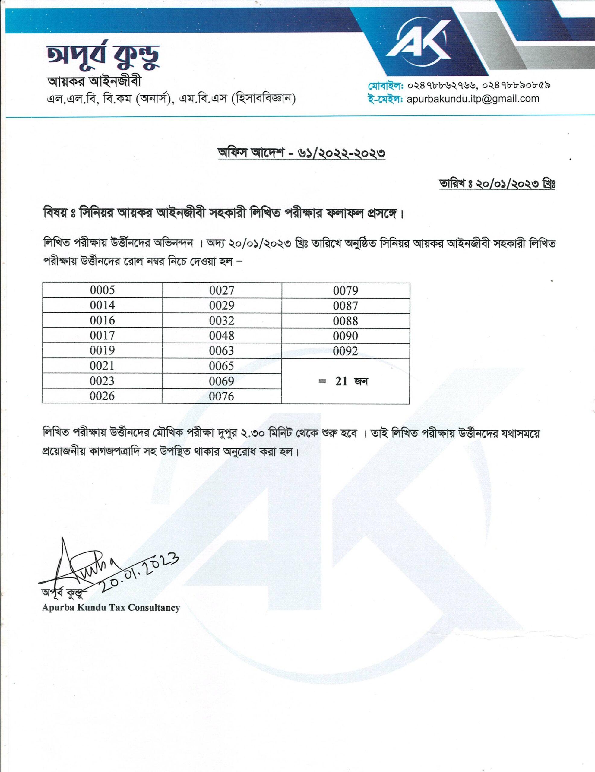 সিনিয়র আয়কর আইনজীবী সহকারী লিখিত পরীক্ষার ফলাফল